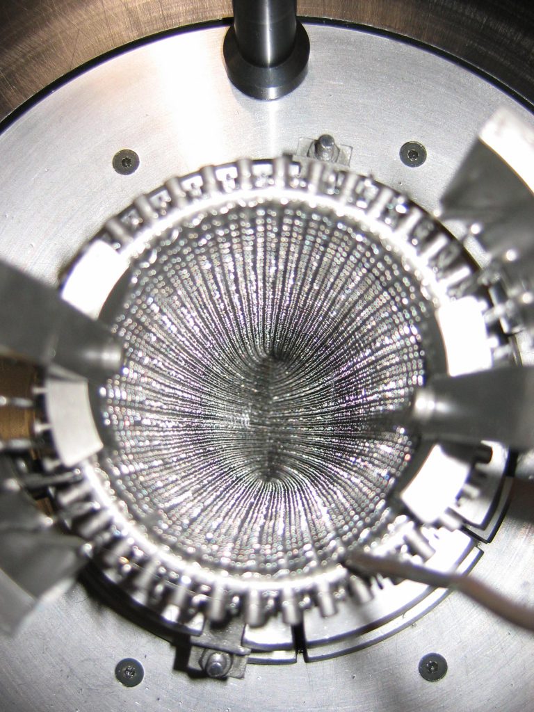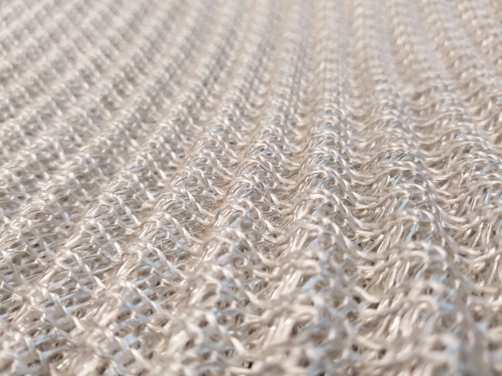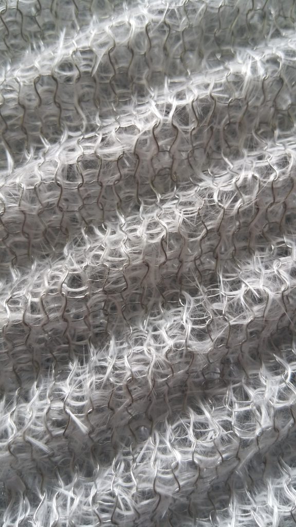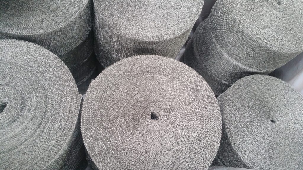 Knitted mesh is made from metal or non-metal wires or a combination of metal and non-metal wires in a structure of continuous interlocking asymmetrical loops. The mesh is predominantly made in tubular form much like the socks on your feet and is typically made in continuous rolls. Anything that can be drawn into a filament can be knitted – Wire Mesh Industries knits with all forms of stainless steel, monels, hastelloys, incoloys, mild steel, duplex stainless steels, copper and more as well as non-metals such as HDPE, PTFE, fiberglass and more. Stocking widths run from as little as 10 mm flat width to more than 800 mm flat width and wire diameters from as small as 0.1 mm to bigger than 0.4 mm diameter.
