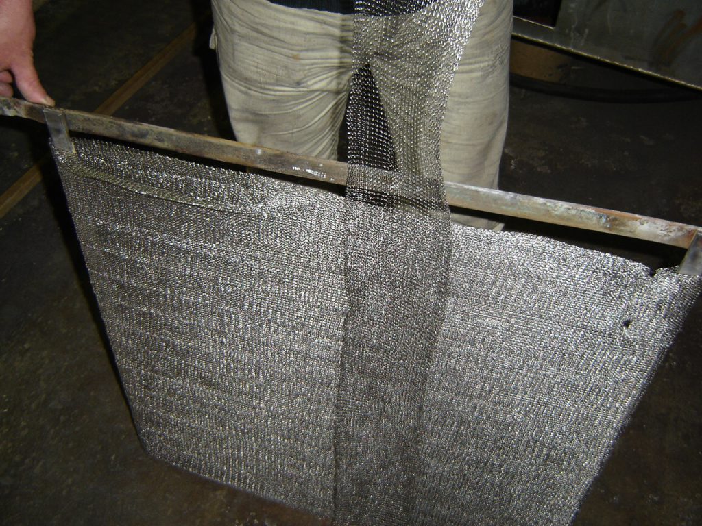 The most common uses for knitted mesh stocking are in the manufacture of knitted mesh mist eliminators [filters], the manufacture of automotive components, the protection of insulation blankets from abrasive damage and the manufacture of cathodes for metal recovery in electrowinning cells. The ability to mix or change wire diameters, apertures, the corrugations or crimps in the knitted mesh, the layering and number of layers of knitted mesh, the material of the knitted mesh and more means the scope of applications for the use of knitted mesh are almost without end.
